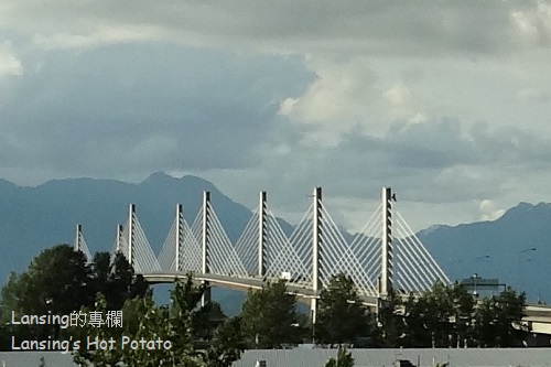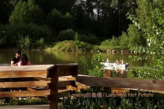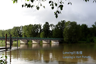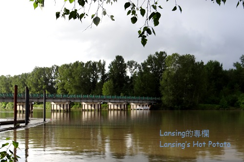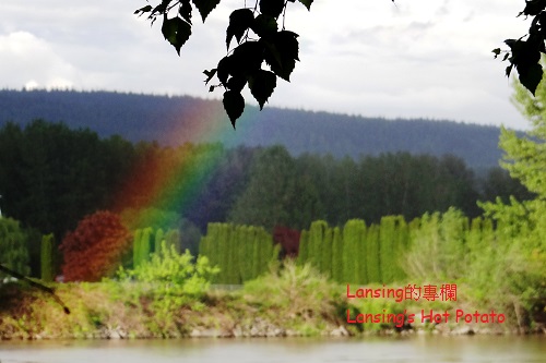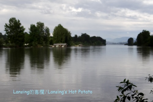 一到河邊就見彩虹,只是瞬間即逝,沒來得及抓到更好鏡頭。 有人說見到彩虹代表好運,真假不重要,姑妄聽之,美景讓人開心倒是絕對。剛下了點小雨的空氣中充滿水氣,太陽打我後方照到河對岸時,光線遇半空中的水滴而產生折射,是彩虹的成因。 彩虹顏色從大圈往小圈依次是紅橙黃綠藍靛紫,也有色帶剛好相反,人稱「霓」的,紫色在最外圈紅色在最內圈。我不記得是否曾經見過。 公園步道位於菲沙河支流Bedford Channel的南岸,站在步道上得見河水一路從東邊蜿蜒流來。 菲沙河全長1375公里,河水並不清澈,水流也急,但是她是BC省最長也最重要的一條河流,早年為工商業發展經濟命脈。 滾滾黃沙河造就了多少沿岸美景,又孕育了多少悲歡離合的故事?歷史不能一一記載,憑空多了眾多想像空間。