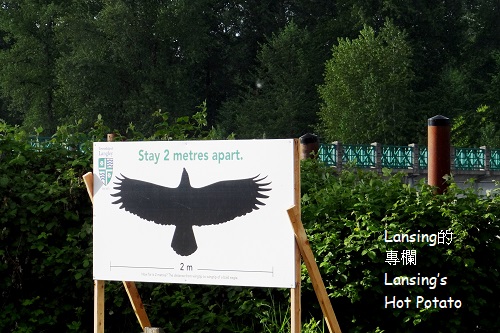 為了確保民眾保持兩公尺安全距離,停車場入口立了大大的標示。 這看板與市區常見的「兩個小人間隔兩米站立」者不同,公園局處找了老鷹當代言人。 如果翅膀張開時長度約兩米的話,這鷹應該是魚鷹(osprey)。魚鷹,顧名思義,是捕魚高手,捕獲率最少25%,最高可達70%以上,也就是說,四次出擊中最少可抓到一條。