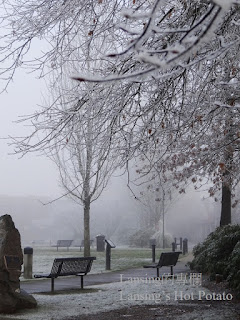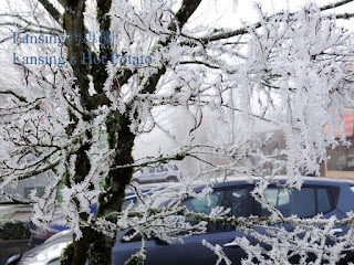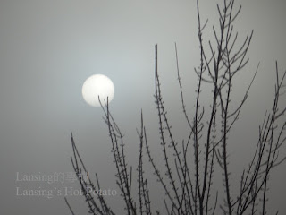 前幾天天氣極寒 又碰上霧大 外頭的世界成了難得一見的奇景 樹上是白花花的冰 路上是朦朧朧的霧 興起露臉卻又稍縱即逝的太陽 成了半透明的乒乓球 完全失去往日的威力