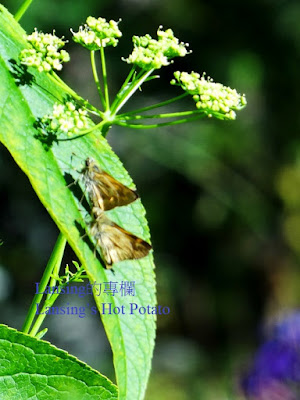 第二種是Fiery skipper or Jet fighter 展翅時長約2.5公分 橘黃色帶黑斑點的是公蝶,深棕色帶橘黃點的是母蝶 因翅膀豎起時的樣子像戰鬥機而得名 北美種,數量不算多 我看到一對