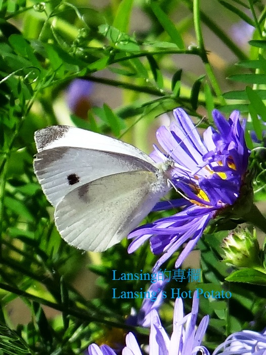 第一種是紋白蝶或稱白粉蝶(Pieris rapae or Cabbage white) 中小體型,展翅時約長3-5公分 白色或淡黃色,前翅尖為黑色 公蝶翅膀上有一個黑點,母蝶則有兩個黑點 紋白蝶是歐亞非種 1860年間在加拿大東岸被發現 現行跡遍佈加拿大東西岸,成為鄉間野外熟見的蝴蝶 我看到兩隻