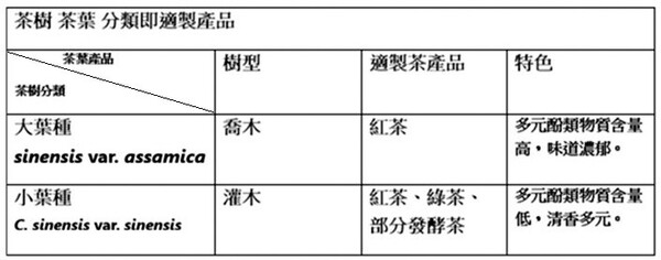 茶的 品種和製作工序 茶;茶樹 (Camellia sinensis) 的植物葉片等組織所製成的。茶類風味能夠多元的關鍵之一就是品種。茶樹在分類學上歸類為山茶科(Theaceae)、茶屬(Camellia),山茶科最著名的品種是茶樹,葉含咖啡鹼是世界著名飲料之一;其中包含了許多亞種,最常見的是被稱為阿薩姆種的大葉種,及中國大陸種的小葉種;大葉種適製紅茶,小葉種則適合製作紅茶、綠茶與各式部分發酵茶。