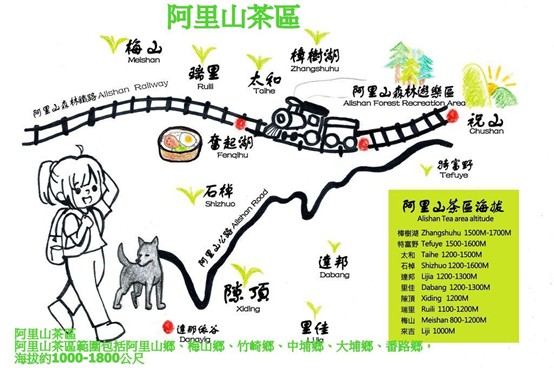 阿里山茶區範圍包括阿里山鄉、梅山鄉、竹崎鄉、中埔鄉、大埔鄉、番路鄉,海拔約1000-1800公尺,和梨山茶區、杉林溪茶區並列為台灣三大高山茶區,阿里山茶區以梅山鄉、竹崎鄉、阿里山鄉產量最大。茶區面積約2000公頃,每年可收成五次,以春茶及冬茶品質最好。主要的茶樹品種為青心烏龍、金萱、四季春及翠玉。