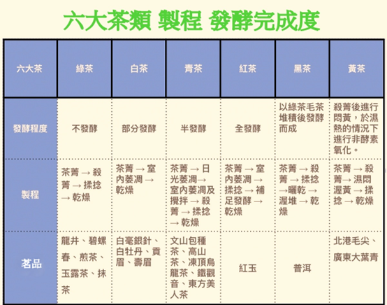 六大茶類 六大類的茶葉,地區不同基本生產程序各有一定步驟,生產過程會影響其茶葉產品品質 綠茶、黃茶、白茶、青茶、紅茶與黑茶。 茶類的製程與茶的特性分類想成; 茶葉以製作過程中發酵程度 茗 紅茶 95%發酵,黃茶 85%發酵,黑茶 80%發酵,烏龍茶 60~70%發酵,青茶 15~20%發酵,白茶約 5~10%發酵,綠茶完全不發酵。