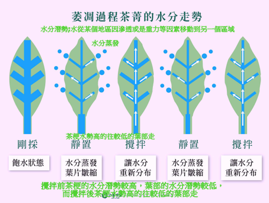 註 細胞通透性-Permeability 物質穿越細胞膜的能力,細胞膜會選擇性地控制哪些物質能進出,以維持內部環境穩定,小分子、脂溶性物質易通過,而大分子則需透過通道蛋白或運輸蛋白。 茶的萎凋 萎凋是讓新鮮茶葉「失水、變香、變軟」的過程,是多種名茶風味形成的重要步驟。 減少水分(走水),軟化葉片,增加韌性,促進氧化酶作用,減少青味(菁味),引出香氣與滋味。製茶過程中關鍵的第一步,指將鮮嫩的茶葉攤開,在日光、室內或熱風作用下適度散失水分,使葉片軟化、失去青草氣,同時促進細胞內生化反應,形成茶葉獨特香氣、滋味和水色,為後續揉捻、發酵奠定基礎,常見於紅茶、烏龍茶、綠茶等茶類,亦可指植物因失水而枯萎的現象。 萎凋方式 日光萎凋;利用陽光和熱能加速水分蒸散,通常先進行。使茶葉產生充足香氣,需注意陽光強度。 室內萎凋;日光萎凋後移至室內陰涼處繼續失水並發酵,控制溫度和濕度,進行發酵,需翻動(浪菁)使水分均勻散失並促進酶活。是決定茶葉品質的關鍵階段。 熱風萎凋;在陰雨天或需快速萎凋時,用熱風吹拂茶葉,加速水分散失。 攪拌-浪菁;在萎凋過程中翻動茶葉,促進水分重新分配和葉片摩擦,加速發酵。 茶葉 萎凋 成效 剛採摘的茶葉(茶菁)散失部分水分,使其變柔軟,並促進內部發生化學變化,是形成茶葉獨特香氣、滋味和顏色的基礎,俗稱「走水」。萎凋包含日光萎凋(日曬)和室內萎凋(靜置),目的是降低水分、提高細胞通透性,讓酵素作用產生發酵,並使葉片變軟,利於後續揉捻。 白茶、紅茶、烏龍茶(青茶)都需萎凋,但程度和時間不同。 茶的乾燥 茶的「乾燥」是初製步驟,主要目的是殺青並降低水分至5%以下,防止變質利於保存,形成可飲用的「毛茶」;而「烘焙」則是後製精製的關鍵,通過控制火候與時間,利用「梅納反應」轉化茶葉內含物,創造出豐富的香氣、醇厚滋味與溫和口感,改變茶葉的「生」與「熟」特性。簡單說,乾燥是為了保存與穩定,烘焙是為了增添風味與層次。 乾燥是烘焙的基礎,不可替代。乾燥過的茶葉(毛茶)可以經過烘焙,產生不同的“熟”度與風味;而綠茶等未經發酵的茶,其「乾燥」可能就是最後的定型步驟(殺菁)。烘焙的程度(輕、中、重)決定了茶葉的香氣與口感,從清香到濃郁,提供多樣化的品飲選擇。乾燥是烘焙的基礎,不可替代。 乾燥 (Drying) 目的;殺死酵素活性,防止茶葉繼續發酵,並將水分降至適合儲存的水平-<5% span="" style="font-family:, serif" data-mce-style="font-family: , serif;">,以延長保存期限。 時機;初製過程的最後一步,是成為毛茶的必要工序。 方法;綠茶可用炒、蒸、曬等方式,烏龍茶多用烘乾機。 結果;形成乾燥的毛茶,可直接飲用,風味相對單純。 烘焙 (Roasting/Baking) 目的:進一步轉化茶葉成分,產生焦糖化、梅納反應,提升香氣(如熟果香、焦糖香),降低苦澀(咖啡因昇華),使茶湯更溫和、口感更醇厚。 時機;步驟在乾燥後的毛茶上進行精製。 方法;傳統炭焙或現代電烘焙,透過精準控制溫度與時間。 結果;創造出豐富的「熟茶」風味,如凍頂烏龍、鐵觀音等,茶湯色澤也會從清亮轉為深沉。 綠茶 綠茶是以適宜茶樹嫩葉為原料,經殺菁、揉捻、乾燥等工藝過程製成的茶葉。茶乾色澤和沖泡後的茶湯以綠色為主調,清湯綠葉是特徵,故名綠茶。