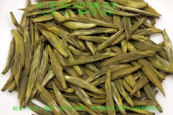 日本茶(煎茶),由於煎茶多數以蒸菁工藝製成,茶乾的色澤上翠綠鮮明,接近茶葉天然本色,口感甘甜,有著日本獨特的旨味(UMAMI),在日本為最受歡迎的綠茶種類。靜岡煎茶、京都玉露。 黃茶 綠茶製作中濕熱導致的黃變現象。 明末清初,受控黃變技術成熟后,黃茶從綠茶工藝中獨立分化,與唐宋時期自然黃化的茶品形成區別。 現代制茶中,悶黃原理被應用於改良綠茶苦澀味及花茶茶坯口感,通過濕熱作用促進滋味醇和與香氣協調 。 黃茶的分類 依據鮮芽葉的老嫩程度劃分的,主要分為;黃芽茶、黃小茶和黃大茶。 黃芽茶;單芽或一芽一葉,黃茶芽香味鮮醇,主要包括湖南的“君山銀針”,四川的“蒙頂黃芽”和安徽的“霍山黃芽” 。 四川蒙頂一心或一心一葉茶芽,做工精細、草紙包裹、悶黃做色的工序。“包”與“悶黃”(或稱“堆積攤放”)是關鍵的黃茶工序,用草紙包裹後進行,促使茶葉在濕熱中轉黃,口感醇厚,香氣獨特-炒米香,產量稀少。獨特工藝和“一心一葉”的標準,成為珍貴的黃茶極品。