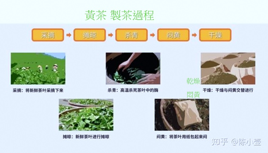 黃小茶;黃小茶是採摘細嫩芽葉加工而成,湯色橙黃,香氣清高,味道醇厚,甘甜爽口。 主要包括湖南的“北港毛尖”、“溈山毛尖”,湖北的“遠安鹿苑”和浙江溫州、平陽一帶的“平陽黃湯”。 黃大茶;一芽二、三葉甚至一芽四、五葉為原料製作而成。 湯色深黃顯褐,葉底黃中顯褐,滋味濃厚醇和,具有高嫩的焦香。 主要包括安徽霍山的「霍山黃大茶」和廣東韶關、肇慶、湛江等地的「廣東大葉青」。 悶黃工藝的特色在於「悶黃」是關鍵的「非酶性氧化」工序,在接近綠茶的基礎上,利用濕熱環境使茶葉葉綠素轉黃,形成獨特的「黃葉黃湯」,並去除青澀,提升醇和、甘甜的風味,帶有玉米、穀物或堅果香,口感溫潤,是黃茶區別於綠茶的核心技術。悶黃就是茶葉殺青揉捻後,用紙或布包裹或遮蓋,放入悶黃室或悶黃機內,控溫控濕一段時間。由於黃茶的悶黃過程,利用濕熱作用或殘餘酶作用,使得茶葉中酯型兒茶素大量減少,導致黃茶香氣滋味變醇。 黃茶“悶黃-悶堆”是溫和條件的“濕熱黃變”。 “濕熱黃變”不僅要“黃湯、黃葉”,更要形成黃茶的“清銳甜純、醇厚甘爽”的香味特徵。採用多次「悶黃」,逐步「黃變」,並配合運用選料、萎凋、殺青、揉捻、烘炒及乾燥等加工技藝,形成了各產區黃茶的地域品質特徵。 黃茶 黃小葉製作流程 鮮葉採摘 →萎凋→ 殺青 → 揉捻 → 悶黃(包裹濕布) → 乾燥。