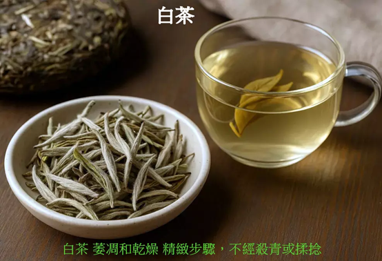 ‘黃化茶’ ‘黃化茶’則是從大田群體品種茶園中採用單株選育方式選育的-否極泰來;變種。 在這種環境下生長的茶樹極易由於外界各種因素的影響導致芽變,長出黃白色的枝葉,我們把這種由枝葉單獨扡插繁育成的新品種稱為「黃化茶」。 白茶 白茶是採摘後,不經過殺青或揉捻,只經過日曬或文火乾燥後所製成的茶葉。白茶是一種微發酵的茶。因為茶的綠葉帶有銀白色的毫心,和其他茶葉相比,顏色也較淺淡,故得名「白茶」。經過「萎凋」和「乾燥」兩大工序,其中萎凋是白茶初製的核心過程,也是形成白茶品質關鍵的核心工序。不炒不揉,僅以室內萎凋控制溫濕度,只要散發出香氣,就可進行乾燥。也因茶葉不揉捻,只將細嫩、葉背滿是茸毛的茶葉曬乾或用文火烘乾,而使白色茸毛完整的保留下來,因此外型可見茶菁原形,不似一般烏龍茶的球狀,或紅茶的條索狀。白茶白毫顯露。比較出名的出自福建東北部地區,有白毫銀針、白牡丹、貢眉、壽眉等不同等級的白茶。白茶的原材料均多採自福鼎大白茶、福鼎大毫茶、福安大白茶等品種。若採單芽按白茶製作工藝製成的茶稱為白芽茶,如白毫銀針;若採一芽葉、一芽二葉按白茶製作工藝製成的茶稱為白葉茶,如白牡丹、貢眉等。
