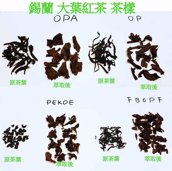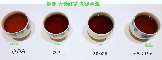 斯里蘭卡常見的原葉茶分級有最基本的Pekoe、全葉紅茶OP和OPA等,用茶葉外型、顏色和味道來分辨的話,「Pekoe」呈現球型葉、葉片比較細碎,茶湯為暗紅色、香氣口感滑順;「OP」葉形比較細長,顏色和味道皆介於Pekoe和OPA之間;而「OPA」葉子特徵則為長、寬、大,茶湯顏色比較透紅的感覺,香氣口感清爽。