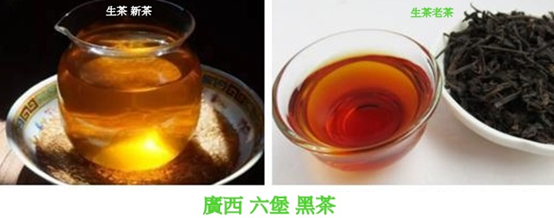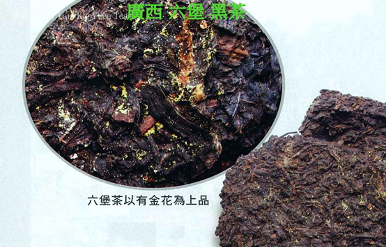 廣西六堡大葉茶(六堡茶)是廣西梧州六堡鎮產的黑茶,可追溯到唐宋時期,清代已列為全國名茶之一。以廣西當地高山、酸性紅壤上生長的廣西大葉種茶樹為主要原料。具有「紅、濃、陳、醇」的特色,並有獨特的「檳榔香」。它歷史悠久,有「可以喝的古董」之稱,越陳越香,以渥堆後發酵工藝和金花」菌著稱,有健胃、消脂等保健功效。 六堡茶毛茶應當符合; 葉底:黃褐嫩匀。條索:緊結圓直勾齊。色澤:青褐光潤。湯色:紅黃明亮。淨度:淨。 六堡大葉茶採摘嫩葉稍後,經過殺青、揉捻、渥堆(核心發酵)、乾燥,再經長期陳化,獨有金黃霉菌(金花)的產生是其特色。六堡茶是越陳越好,價值越高,具有收藏和品飲價值。茶湯呈紅褐色,口感醇厚甘滑,帶有獨特檳榔香或木質香,滋味醇和,有甜感。有助於消暑解膩、調腸胃、降脂減肥、降血糖等。 毛茶製作工藝的工序依次為:鮮葉→殺青→初揉→渥堆→復揉→乾燥。精製加工;乾燥毛茶→篩、風、揀→拼配→加水增濕渥堆→攤放→蒸壓(或散放)→陳化→滅菌→成品包裝。 新茶性寒,刺激性強,腸胃不好的人飲用生茶之後會產生胃痛或者茶醉現象,在清熱降火方面功效明顯。陳茶茶性較溫和,適合人群廣泛。新茶,經過渥堆這道工序會有很濃烈的渥堆味,味道不是很好,陳化兩三年之後,渥堆味會逐漸散去,轉為熟茶獨特的清新甜香; 熟茶的新茶性熱,陳茶性溫。新做好的熟茶喝多了容易上火,陳年熟茶則比較溫潤舒適。 生茶-傳統工藝製作的茶經輕微發酵,自然陳化而成,這種茶稱為生茶。沖泡後茶湯色澤呈金黃色或栗黃色,具有生津止渴,提神明目之功效。喝起來有淡淡的青香,回甘明顯。隨著存放時間的加長,苦澀味會減淡,陳放多年的六堡農家茶也同樣具備「紅、濃、陳、醇」的特點。