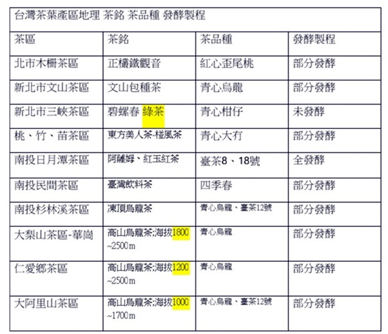 臺茶 六大茶系 台灣綠茶-碧螺春綠茶、清香型條形包種茶-文山包種茶、清香型球形烏龍茶-高山烏龍茶、焙香型球型烏龍茶-凍頂烏龍茶和鐵觀音等、東方美人茶,以及臺灣紅茶-蜜香紅茶。