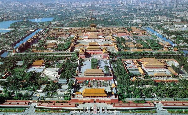 北京紫禁城(現稱故宮)是明清兩代皇宮,先後有24位皇帝在此居住,紫禁城的房屋傳說有九千九百九十九間半,只比天帝的一萬間少半間,據現代古建築物專家的科學統計,故宮大小宮、殿、堂、樓、閣等共有房屋8700多間.紫禁城占地72萬平方米,包括宮殿樓在內的建築共786種,是世界上最大的建築群. 故宮的一草一木都有某種象徵意義,體現了古代中國的文化精粹.“紫禁城”這個名字就與中國古代哲學和天文學有關.中國人認為“天人感應”或“天人合一”,因此故宮的結構是模仿傳說中的“天宮”構造的.古代天文學把恒星分為三垣,周圍環繞著二十八宿,其中紫垣紫府(北極星,昊天上帝太一所居)正處中天,是所有星宿的中心. “天有紫微宮,是上帝(“上帝,太一神,在紫微宮,天之最尊者.”)之所居也.”紫微宮又叫紫府、斗府,由此可知,昊天上帝是居住在紫微宮.天子皇帝所居紫禁城為對應昊天上帝居紫微宮.紫禁城之紫,就是“紫垣正中”之紫,意為皇宮也是人間的“正中”.“紫”則指皇室所居,尊嚴無比,嚴禁侵擾. 故宮裡的地名,都有“仁”、“和”、“中”、“安”等字,如太和殿等,這些字所代表的意義是中國儒家思想的核心,即“中正”,“仁和”,突出傳統的儒家理念.
