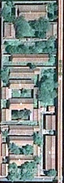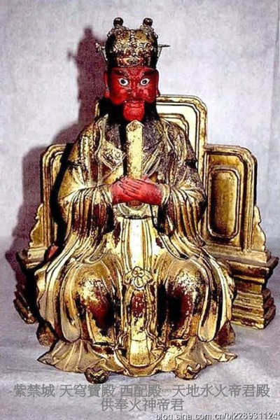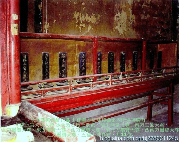 混元八卦洞神龐元帥,紅臉金甲,左手托葫蘆,右手執錘,玉帝封其為雷部天君,降魔除惡. 上清神化陰雪畢元帥,原為雷精,藏於地中,寄胎於田間,得千年石乳鐘氣而生.生時白晝霹靂,火光沖天,風雨驟起.被玉帝封為雷部畢元帥,掌十二雷霆,上管天地潦涸之事,衝擊不仁不義之人,下誅群魔出沒. 混元八卦洞神劉元帥,紅臉金甲.出身貧寒,年幼隨羅真人當侍讀,後得真人傳授,精通五雷掌訣,能呼風喚雨,解百姓困危,被玉帝封為雷神,掌管神霄府事. 雷霆行令使者張天君、上清神烈陽雷苟元帥、雷霆天醫五當陶天君均是雷 部正神二十四天君中三位雷神. 描金紅油漆神龕兩側供紅油漆神龕桌,內供神牌,南側龕桌內所供神牌有:九天雷祖大帝、六天洞淵大帝、可韓司丈人真君、九天生神上帝、斗母摩利支天大聖、東極注生大帝、長生保命天尊、南斗六司星君、天地人黃甲君、三台華蓋星君、十二宮辰星君、十一道曜星君,共12位.北側龕桌內所供神牌位有:二十八星君、 三垣帝座星君、天都萬壽天尊、北斗九皇星君、福祿壽星真君、三十二天帝君、保運妙化天尊、六波天生帝君、碧玉宮太一大天帝、南極長生大帝、雷聲普化天尊,共11位. 西配殿--天地水火帝君殿 西配殿內供,三官大帝三尊,銅鍍金胎,文昌帝君一尊,銅鍍金胎.”初設所供非文昌帝君像,而是火神帝君,故西配殿為天地水火帝君殿.明間供描金紅油漆神龕一座,內供火神帝君和三官大帝銅像,神像前供“當今皇帝萬歲景命星天”牌位即本命牌.火神帝君,紅臉,怒目,頭戴沖天冠,坐於寶座上,後置屏風.