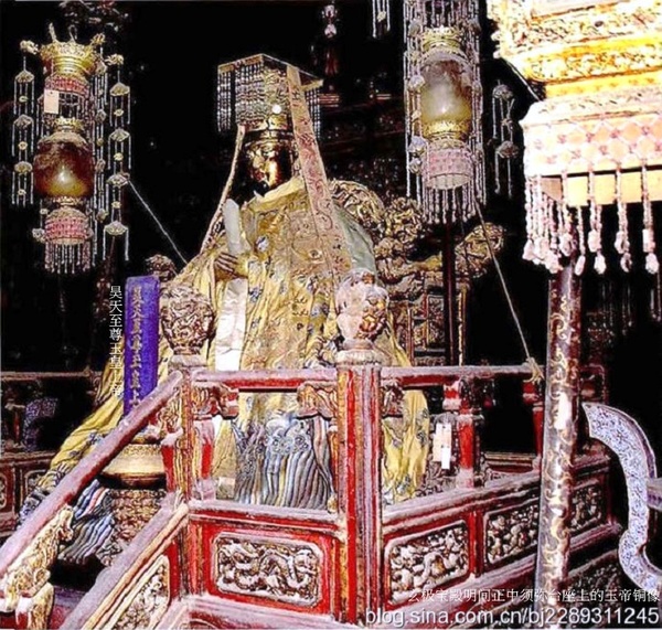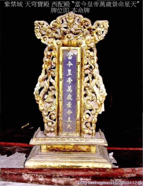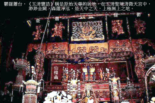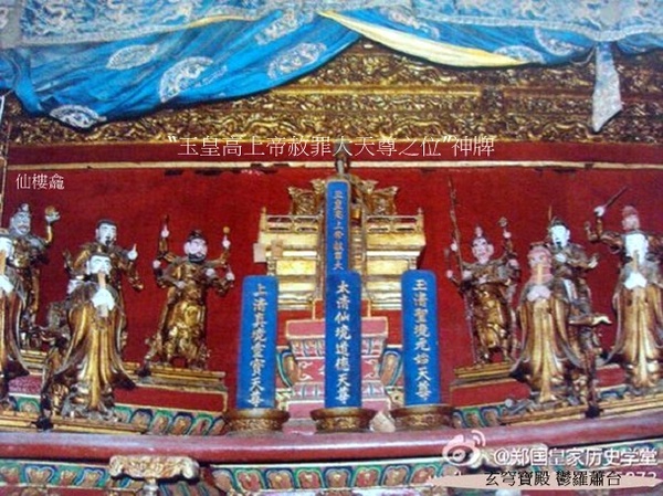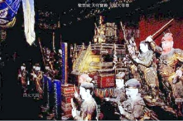 天穹寶殿的建造年代,具考;明代紫禁城裡沒有這座宮殿.據《清宮述聞》記載:“玄穹寶殿,清順治時改建後,以避諱,改玄曰天.”玄穹寶殿為清順治時改建,康熙時為避“玄燁”名諱而改稱天穹寶殿. 天穹寶殿所供神像俱在, 且保存完好,供奉位置基本保持原狀. 道教那個神系裡面,最高地位的是三清,元始天尊,道德天尊和靈寶天尊,下面有四御,四御就是三清的四位輔佐神.四御即四帝,是根據神話中的東方青帝南方赤帝西方白帝北方黑帝而編成,即東極青華大帝、南極長生大帝、西極天皇大帝、北極紫微大帝,四御輔助玉皇大帝治理宇宙,三清負責傳播中華大道. 根據《清宮述聞》的記載,玄穹寶殿是順治時候改建的,因為順治是進入紫禁城的第一個皇帝,在宮裡建了一個供奉天帝的宮殿.證明自己是承天之位,是一個正統. 「天穹寶殿要舉辦三個道場,第一個道場是天臘道場,就是正月初一,就是新年這一天要在這個地方舉辦一個非常隆重的道場.那麼到了正月初九的時候,就是玉皇大地的誕生之日,這天要舉辦一個天誕道場,還一個道場是萬壽平安道場,就是皇帝的生辰,舉辦一個道場.天子,顯揚阿諛;皇帝,承天之位的,是從天傳下來的,是正統的.」 註: 古代“臘日”祭先祖、百神之制,道教謂之五臘日.正月一日為天臘,是“五帝校定生人神氣時限長短”之日;五月五日為地臘,是“五帝校定生人官爵、血肉衰盛”之日;七月七日為道德臘,是“五帝校定生人骨體枯盛”之日;十月一日為民歲臘,是“五帝校定生人祿科官爵”之日;十二月為王侯臘,是“五帝校定生人處所,受祿分野”之日. 中國神祇 上帝; 昊天上帝(抽象的宇宙)加五方上帝, 掌管;節氣、農耕、禍福、壽命、國事、戰爭、狩獵. 天神; 日、月、五星、十二辰、二十八宿、風師、雨師、司命等神祇,為上帝使者. 地祇; 皇地祇、社稷、五嶽、四瀆(河流)、四鎮、海、山林、名川諸神, 掌管地域神、農耕、自然現象. 人鬼; 祖先、先公、遠祖、近祖、先臣等賢仕,協助自然、收穫、戰爭、疾病、生死、妊娠等順利. 玉帝散形為混沌元炁(氣),無形無相,在萬象之先,無始無終,自古已固存;聚形乃無極道身,有形有相,開天闢地,為萬天之帝--昊天上帝--三界十方四生六道萬靈真宰--宇宙永恆的最高統治者,居於三十六天大羅天玉京城金闕雲宮靈霄寶殿,上掌三十六天,下握七十二地,君臨一切神、佛、仙、聖,總管天庭和人間、地府要事,因而無論是道教中的至尊“三清”,還是神通廣大、法力無邊的如來佛祖均是玉皇大帝的子孫與臣屬,都要聽命.玉帝於龍漢劫時,以玉皇之炁,與玉清神母(王母娘娘)於三清境之玉清境化生出天寶君.這天寶君即盤古,是盤古幼年之號,也就是說盤古乃玉帝之太子,玉帝命四海之帝助盤古開天闢地,盤古化身天地山川,玉帝感其功,將己之號元始天尊敕封盤古,盤古居於三十五天玉清境玉清宮,遂為三清之首---玉清元始天尊;靈寶天尊太上道君居於三十四天上清境,為玉帝之子孫;道德天尊太上老君居於三十三天太清境,為玉帝之孫;佛祖如來乃玉帝之曾孫.女媧為玉帝之女,老君之母. 百姓對玉皇大帝朗朗上口.在《西遊記》中,玉皇大帝住在九天宮闕裡,南天門外有八大天將把守,閒雜人等不得入內.“辦公”的靈霄寶殿祥雲繚繞,瑞靄浮游;蟠龍金柱頂天立極,金光耀眼.兩旁排列著文武仙班.文有太上老君、太白金星、文典星、邱真人、許真人等,可謂人才濟濟;武有托塔天王、哪吒太子、巨靈神、四大天王、二十八宿、九曜星官、四值功曹、五方揭諦等,可謂猛將雲集.玉帝身著九章法服,頭戴十二行珠冠冕旒,手持玉笏,微凝雙目,面沉似水,不怒而威,真是儀衛齊整,法相莊嚴.在中國人的心目中,玉帝是天上的皇帝、仙界的主宰,同時又主管人間的方方面面,是中國最大的萬能神祇(ㄕㄣˊ ㄑㄧˊ). 據清《國朝宮史》記載:“天穹寶殿,祀昊天上帝”,清《天穹寶殿檔案》記載:“天穹寶殿內閣上供玉帝一尊,金胎,手執玉圭,從神十四位,銅鍍金胎.”,從上遠近景正面側面相片可見仙樓龕內所供玉皇上帝金像前立“玉皇高上帝赦罪大天尊之位”神牌. 仙樓龕玉帝前方下一級有三清天尊的三個神牌,左邊書:玉清聖境元始天尊;中間書:太清仙境道德天尊;右邊書:上清真境靈寶天尊.