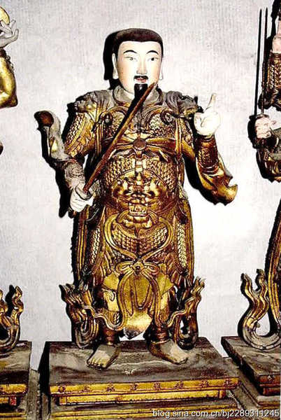 天將一雙 赤心忠良王天君(王靈官)和太歲殷元帥為三十六天將之二將.王靈官為南斗離星的化生,封為“火府天將”,紅臉虯鬚,怒眼圓睜,著金甲,右手執鞭,一副鎮妖降魔的威猛氣派. 太歲殷元帥,白面獠牙,怒眼圓睜,四臂,所執法器有方天畫戟(戟杆上掛一幡)、帝鐘、日、月,原為紂王之子,母皇后姜氏,一日遊宮園,見地上有巨人足跡,遂以足踐之而受孕,不久帥降生.太歲亦稱歲神,又名歲星,順星.每年都有一個太歲,如逢甲子年,甲子即是“太歲”,逢乙丑年,乙丑即是“太歲”.因歲神為值年之神,掌人間一年禍福,又稱 “值年太歲”,俗稱“歲君”.後來道教又把太歲稱為大將軍.殷元帥是主宰一年的尊神,率領諸神,統正方位,斡運時序,總歲成功.凡吉事勿沖之,凶事勿犯之,凡修造方向等事尤宜慎避. 東配殿-- 九天應元雷聲普化天尊銅像,從神八位. 東配殿為雷神殿.“東配殿內供九天一尊,銅鍍金胎,從神八位,銅鍍金胎連座.” 明間供描金紅油漆神龕一座,內供九天一尊,九天即九天應元雷聲普化天尊銅像,從神八位;雷霆行令使者張天君、上清神烈陽雷苟元帥、混元八卦洞神劉元帥、混元八卦洞神龐元帥、雷霆天醫五當陶天君、雷霆掌令青帝辛元帥、雷霆主令炎帝鄧元帥、上清神化陰雪畢元帥.