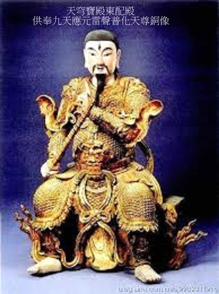 九天應元雷聲普化天尊是雷部的最高神,三目,鉗髮跣足,美髯鬚,著金甲,右手執鋼鞭,左手結斗訣.是元始天尊第九子玉虛真王的化生,專制九霄三十六天,執掌雷霆之政,又稱“神霄真王.其職司“主天之災福,持物之權衡,掌物掌人,司生司殺”.