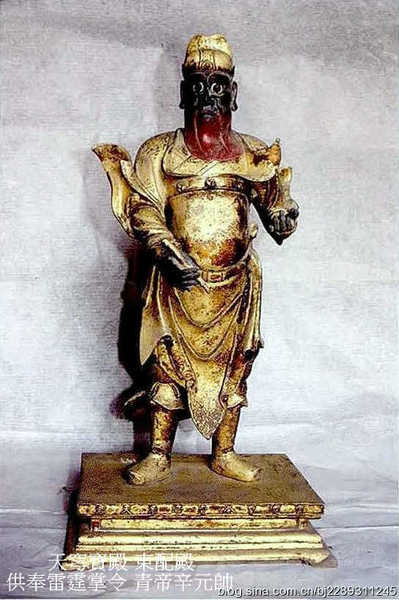 雷霆掌令青帝辛元帥,即辛興,字震宇,黑臉紅鬚,右手執筆管,原為雍州人,因母親吃了化為雞狀的雷神而被雷劈死,震宇怒而用棒擊雞,雷神感其孝心,贈火丹12顆,震宇吃後立即變為雷神.玉帝封其為雷部元帥,清除幽明中的眾魔鬼惡.