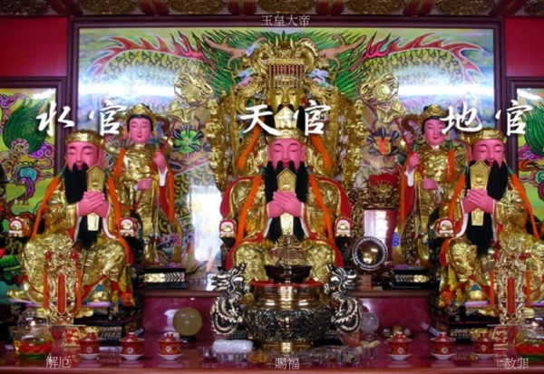 三官大帝即治理天、地、水三界的大帝,也就是天官、地宮和水官,其全名為:上元一品天官賜福紫微大帝、中元二品地官赦罪清虛大帝、下元三品水官解厄洞陰大帝.天官居紫微宮,總主諸天帝王、大聖高真及三羅萬象星君;地官居清虛之宮,總主五嶽帝君並二十四治山、九地士皇、四維八極神君;水官居長樂之宮,總主九江水帝、四瀆神君、十二溪真及三河四海神君.每至三元之日,三官大帝便考籍大千世界的神仙升臨和人品考限以及萬類萬生之期. 天官賜福,主宰眾生善惡之籍和諸仙升降.地官赦罪,考眾生禍福之機,核男女善惡之籍.水官解厄,掌死魂鬼神之籍,錄眾生功過之條. 註:三官大帝 道教中掌管天界(天府)、地界(地府)、水界(水府)三界之神;「天官」、「地官」和「水官」,閩南語俗稱「三界公」,客家話稱為「三界爺」,又稱「三元大帝」,三官大帝掌握了天府、地府、水府間的一切行政事項,是極為崇高的神祇,神格僅次於玉皇上帝,所以民間寺廟常配祀於玉帝殿前,同受敬仰. 閩南人會在廟宇或家宅門口設置香爐,祭祀上天高真,泉州人稱之為「天公爐」(玉帝爐),認為是祭祀玉皇上帝所用;漳州人卻稱之「三界公爐」,因為古時王公、貴族、或者有敕額的寺廟才允許祭天,一般庶民不能祭天,連冬至、新正、玉皇誕、謝平安等祭祀玉帝時都往往呼請三界公做為代表.今日臺灣人已通稱天公爐. 註:四瀆 首見於《爾雅·釋水》,是指中國古代的河、淮、濟、江四條入海河流,為中國民間信仰的河流神的代表,唐代始稱淮河為東瀆,長江為南瀆,黃河為西瀆,濟水為北瀆.四瀆中,今存黃河、淮河、長江,而濟水古代發源於今河南,流經山東入渤海,因黃河多次改道,侵佔濟水故道,濟水已被併.