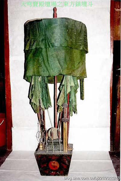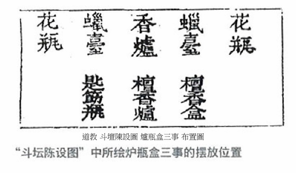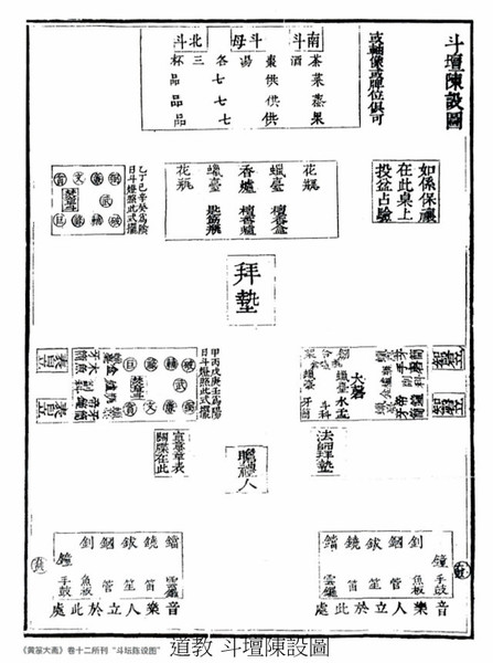 玉帝是天地神祗的管理者,真君、天將、護法和北極四聖等都是玉帝的屬下,負責保衛天庭.配殿的雷神殿所供九天應元雷聲普化天尊及從神,天地水火殿裡帝君,也都是玉帝神系裡的成員. 天穹寶殿的主要用途是舉辦齋醮活動,除舉辦天誕道場、天臘道場、萬壽平安道場等三大道場外,還要舉辦析福道場、度亡道場、祈晴祈雨道場等.這種齋壇模式,諸神不一定是玉帝,也可以是三清、斗母、真武、九天雷神等. 天穹寶殿的法壇佈局 《齋壇陳設圖》,可復原天穹寶殿的壇場分佈格局;醮壇北供主神玉皇大帝,上方是三清神位(即《陳設圖》中三面懸掛聖像的位置).在昊天上帝座前,設供案一張,上置五供,供案左右兩側設金鐘、玉磬.供案前輔拜墊一塊,拜墊東西置經桌四張,東經桌兩張一字排開,上設皇經五部、道經五部、敕劍權杖一份、銅磬一口,銅帝鐘一把;西經桌兩張一字排開,上設皇經五部、道經五部、敕劍權杖一份、木魚一件、銅帝鐘一把.法師和知磬等立於東經桌前,都講與表白立於西經桌前.再於壇的四隅設神牌桌五張,上置五方神牌五份、五方鎮壇斗五份,即於壇的東南方設南方斗,東北方設東方斗,於壇的西南方設西方斗,西北方設北方斗,於壇的東北上方設中央斗.壇的前方於東西再設法桌兩張,上設鐺、鈸、鼓等樂器,是音樂人站立演奏的地方.
