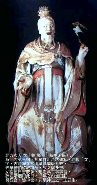北方玄天 女土蝠 屬土,為福(蝠).為北方第三宿,其星群組合狀如箕,亦似「女」字,古時婦女常用簸箕顛簸五穀,去棄糟粕留取精華,故女宿多吉. 女宿值日吉慶多,起造興工事事昌,葬埋婚姻用此日,三年之內進田莊.癸從官,陰神也,女星神主之,主丑生.