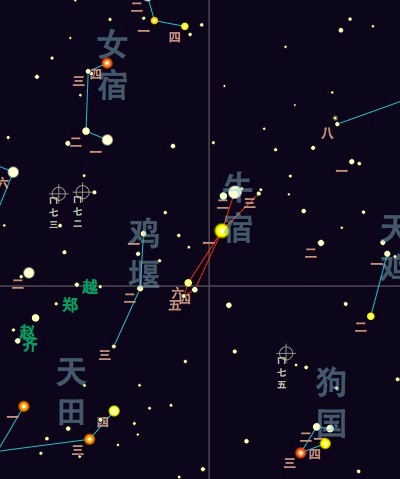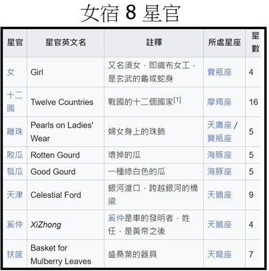 女宿; 北方玄武七宿第三宿,位於寶瓶座,屬北玄武之龜。 女宿是織布女工,又名須女或婺女。 女宿共設星官8位,其中主星官女包含4顆星:女宿一、二、三、四,即寶瓶座ε、μ、4、3,最亮的女宿一(寶瓶ε)僅為四等星。 從織女向牛郎作一假想的連線,並延長約一倍的距離,便可找到牛宿。 女宿一位於牛宿二星之左。《禮記·月令》記載流傳於戰國時期的民謠中有“孟夏之月,日在畢,昏翼中,旦婺女中。 “這裡的”旦婺女中“就是說,黎明之前能見到女宿在南方中天時,是初夏季節來臨了。