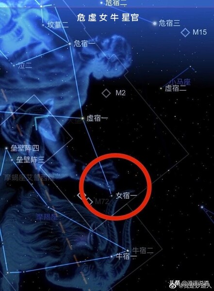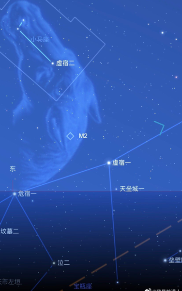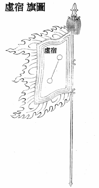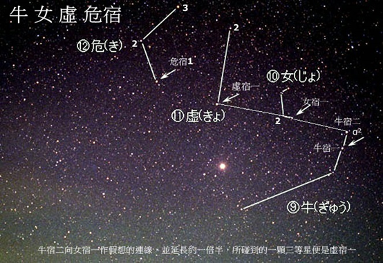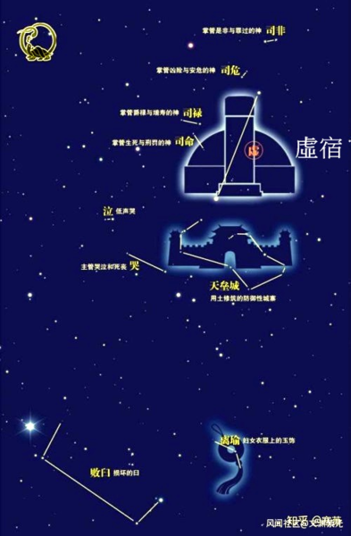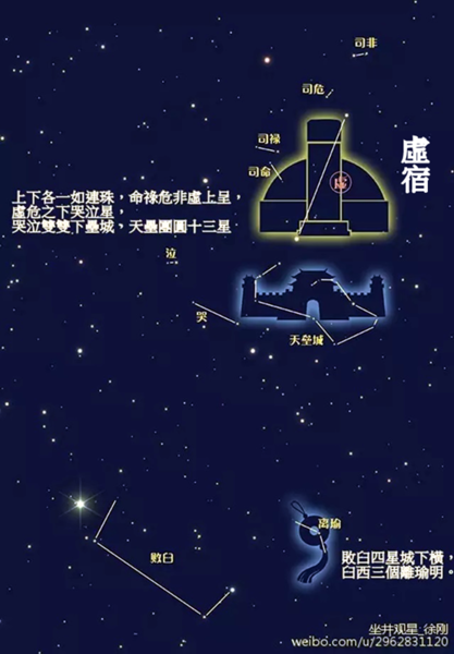 虛,《說文》:「丘謂之虛。 “古代的城邑,往往是丘居的,在城邑毀滅后,丘就改稱為墟。 虛位於北官的中央,《爾雅釋天》:「玄枵,虛也。 “注稱:”虛在正北,北方色黑,枵之言耗,耗亦虛意。 “因此虛有大丘,故地及虛耗的意思。 虛宿在遠古時即已相當著名,成書於周代的《尚書堯典》中記載的四仲中星裡就有虛宿,“宵中星虛,以殷仲秋。 “彼時虛宿在秋分前後的傍晚出現在南方中天。 從牛宿二向女宿一作假想的連線,並延長約一倍半,所碰到的一顆三等星便是虛宿一,它也屬於寶瓶座(寶瓶beta),虛宿二在虛宿一上方,是四等星,屬於小馬座(小馬alpha)。