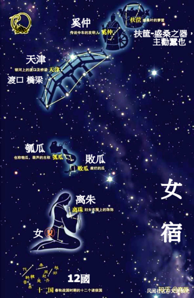 女;共4星,位於寶瓶座,又名須女,即織布女工,是玄武的龜或蛇身。 其星群組合狀如箕,亦似“女”字,源於古代人民對星辰的自然崇拜,古時婦女常用簸箕顛簸五穀,去棄糟粕留取精華,故女宿多吉。 是古代神話和天文學結合的產物。