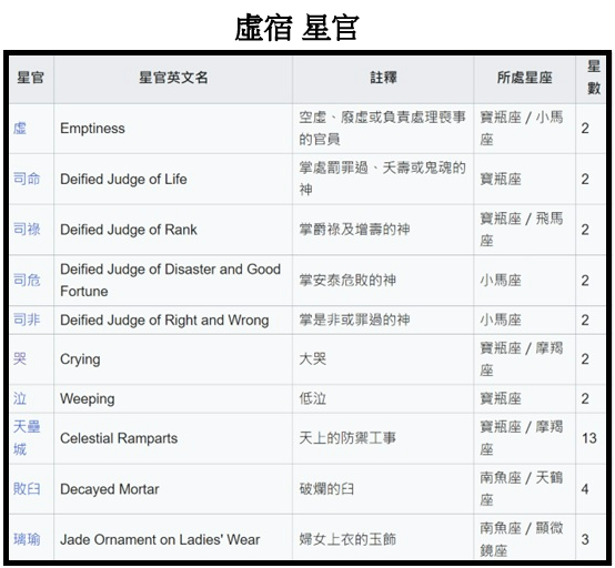 虛;共2星,位於寶瓶座和小馬座,空虛、廢虛或負責處理喪事的官員。