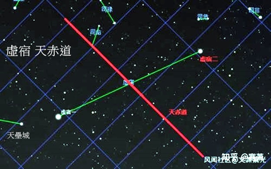 虛宿兩星的連線被天赤道平分,是傳說中帝堯時期的“四仲中星”之一,據《尚書·堯典》記載“宵中星虛,以殷仲秋。 “意思是秋分(晝夜平分點)這一天的黃昏,”虛“星出現在正南方中天位置,據推測,這個虛星就是虛宿一。 當然,由於歲差的關係,現在虛宿在黃昏時刻出現在中天這一天象已經推遲至每年的農曆十月。
