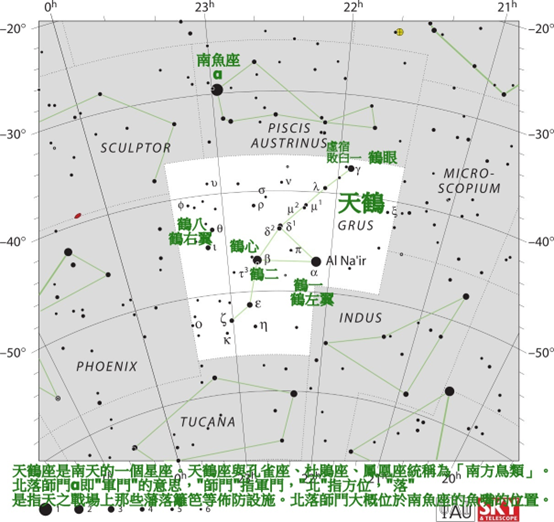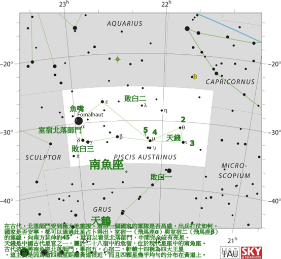敗臼:共4星,位於南魚座和天鶴座,破爛的臼。 《星經》卷下:「敗臼四星,在虛、危南,主政治。 “ 隋 李播 《天象賦》:”敗臼察災而揚輝,天壘守夷而骈照。 ”