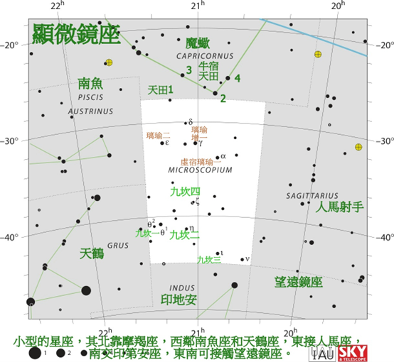 離瑜:共3星,位於南魚座和顯微鏡座,婦女上衣的玉飾。 離瑜三星,在十二國東。 《石氏星經》稱:「離,衽衣也; 瑜,玉飾也。 “ 離瑜三星,在秦代東南列北,主王侯衣服。