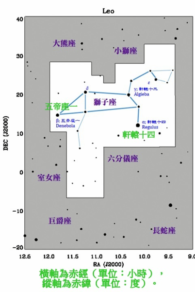 亮星明顯勾勒出獅子圖樣。獅子座的拉 丁名為 Leo,所有格為 Leonis,所以位於獅子前腳、最明亮的那顆星稱為α Leonis,簡稱 為α Leo,中文稱做「軒轅十四」, 乃古代以軒轅黃帝為名的星官。這顆星也稱為 Regulus,是阿拉伯文「王子」之意。獅子座第二亮星β Leo,也稱Denebola 就是阿拉伯 文「獅尾」之意,這顆星中文叫做「五帝座一」。