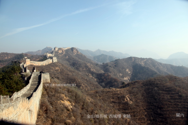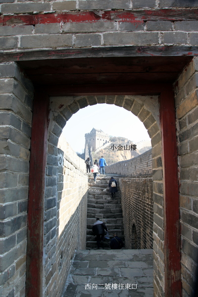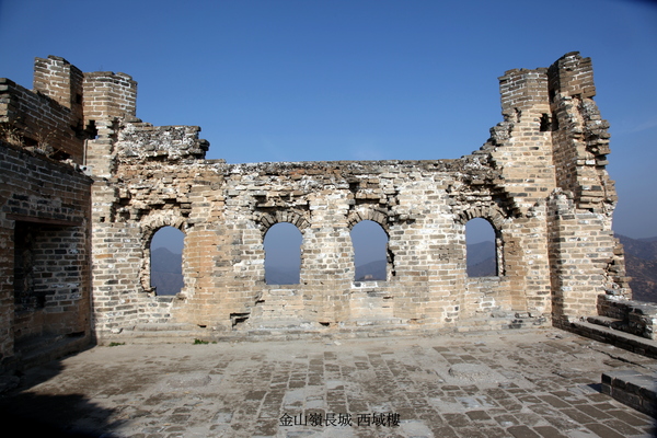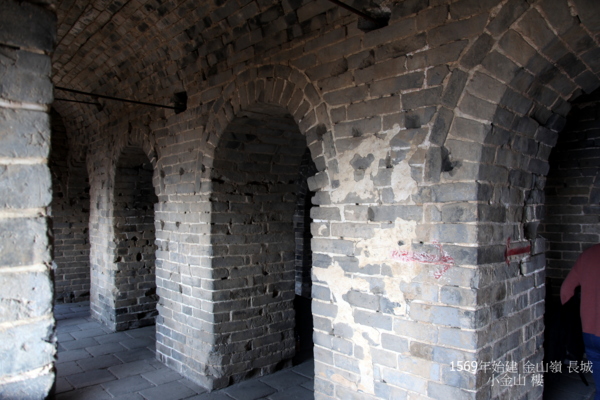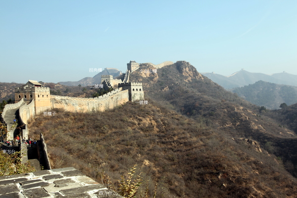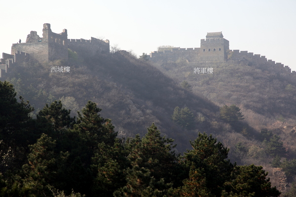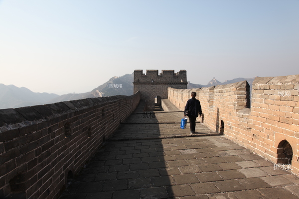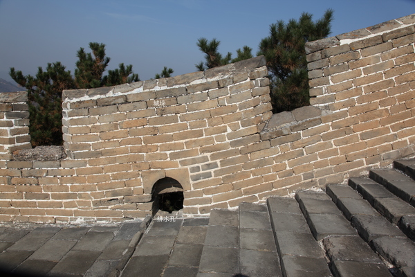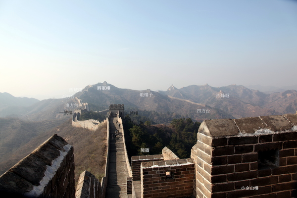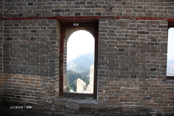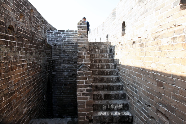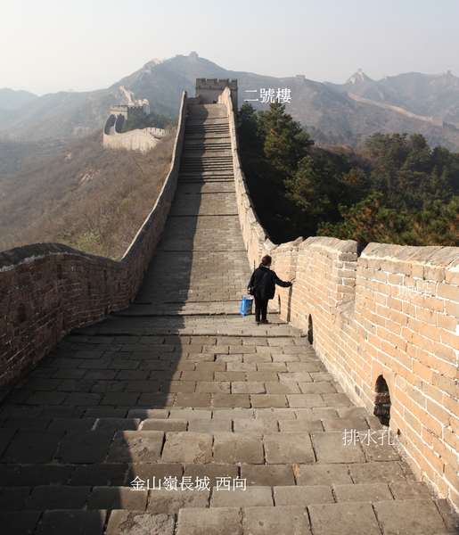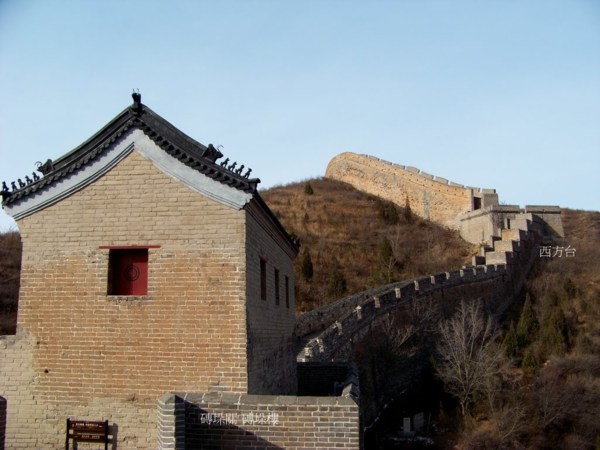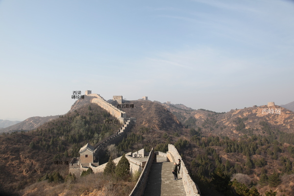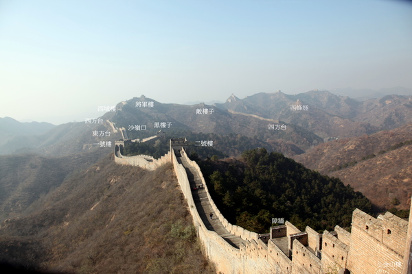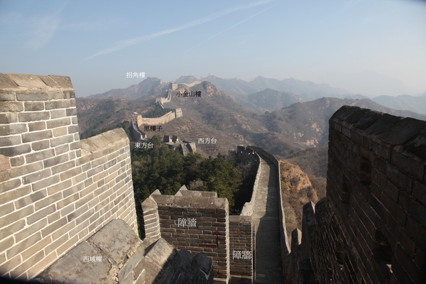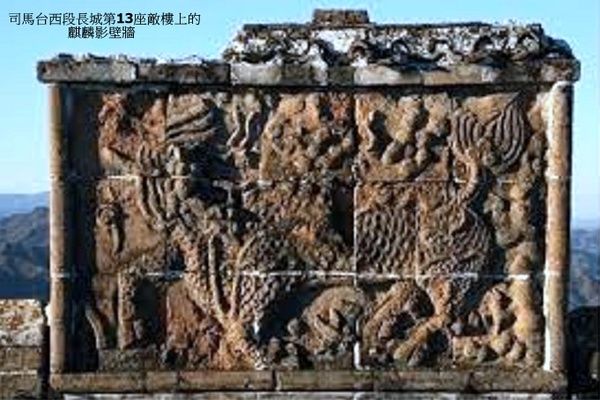 敵樓 稱馬面,是在城牆或城池旁突出的塔樓式建築,在正面或兩面突出城牆外,其主要功能是加強防禦與攻擊牆底敵軍,位於城池邊角處的敵樓則叫角臺.敵樓分為實敵臺與虛敵臺,實敵台下部填實,上部平臺四周有垛口牆.虛敵台為空心敵台,以磚石砌三面而空其中,中有兩層以木板為樓,用木梯上下,每層多置空眼以便窺覘與放箭放銃,增加了可以用來防禦的人力火力,《武備志》記載築實敵臺不如築虛敵臺. 工事結構複雜, 下層的設計有“田”、“井”、“亞”、“回”字型,既能住人,又能起戰鬥防禦作用. 上層是樓櫓(無頂蓋的高臺)和燃放煙火之處. 30人守台,30人守垛,分六伍,備火藥300斤,一個月糧草. 木梆響無事,擊鼓進兵,鳴金(敲鑼)收兵. 敵台等結構的作用包括: 城牆本身的寬度一般有限.增加了敵台結構後,在同樣的高度可以佈置更多的士兵和守城器械.使防禦增寬無死角.敵台正面的凸出部分、以及側面的開窗,便於從兩翼射擊攻城人員.沈括在《夢溪筆談》中強調馬面的作用:「予曾親見攻城,若馬面長則可反射城下攻者,兼密則矢石相及,敵人至城下則四面矢石臨之.」,其高度便於守望敵情.敵臺上的垛口牆、箭窗、射孔等為守城士兵作戰提供掩蔽.上部為平臺的敵台,可以起到烽火臺的作用,用來傳遞軍情.但和烽火臺並不等同.烽火臺是獨立於城牆之外的建築,專事傳遞軍事信息,而敵台是與城牆相連的. 烽燧 又稱烽火、狼煙、狼燧,是一種用於示警的訊號。白天以燃燒摻有糞便的柴草,釋放濃煙來表達訊息,此稱為「燧」.夜裡則燃燒加有硫磺和硝石的乾柴,使火光通明,以傳遞緊急軍情,此稱為「烽」,當時訊號為,來敵百餘,燃一煙、鳴一炮;敵人五百,燃二煙、鳴二炮;千人以上,燃三煙、鳴三砲.通常會在險要處或交通要道上建築用於傳遞這種訊號的高臺,後方看見訊號便知有戰事發生,出兵相助。《武經總要》記:「唐法:凡邊城候望三十里置一烽,須在山嶺高峻處,若有山崗隔絕,地形不便,則不限里數,要在烽烽相望;若臨邊界,則烽火外周築城障」.商周時期便設置了邊境上的烽火臺,最有名的事件是周幽王的「烽火戲諸侯」. (周幽王納了虢石父之議,舉烽火召集諸侯於驪山前(陝西臨潼),諸侯匆忙趕至,卻發覺並非寇匪侵犯,只見周幽王和褒姒在台上飲酒作樂,只好狼狽地退走,此舉僅為博褒姒一笑,類狼來了寓言, 招致西周滅亡.《詩經·小雅·正月》云:「赫赫宗周,褒姒滅之.」) 擋馬牆 障牆 是建築在長城陡峭地段長城牆面上的短牆,障牆高2.5米左右,長差不多是馬道寬度的三分之二.顧名思義,“障牆”就是象屏障一樣的牆. 長城的修築隨山就勢,遇到山坡陡峭的地段,長城也隨之陡峭起來.制高點往往設置敵台’敵樓,也是守軍的運籌帷幄’後勤補給中心,通往陡峭制高點長城城牆通道就設置障礙,減少通道斷面的障牆,避免敵軍攻克城強弱處後長趨直入指揮中心.就建築結構觀點出發,長城是敵樓在陡峭地段的支撐結構一環,藉加強臨近城牆勁度支撐鞏固敵樓,當然城牆本身強度加強並傳遞自重’外力經結構體傳地表由磨擦力抵抗,直至平緩地面. 文字磚 磚上面主要記載了當年修築這段長城的年代以及部隊番號,如“萬歷四年震虜騎兵營造”、“萬歷五年山東左營造”、“萬歷六年振武右營造”等等.這些文字用楷書或隸書寫在磚坯上,燒製而成. 顯示建材及建造品管明代就執行了. 麒麟影壁牆 司馬台西段長城第13座敵樓上,有一塊麒麟影壁牆.影壁牆在上層垛口的西南位置上,與望亭內簷明間相對,上部有瓦頂,影壁心用15塊方磚拼雕出威猛如真的麒麟.靈獸是信仰支柱,加強軍紀’戰鬥力.