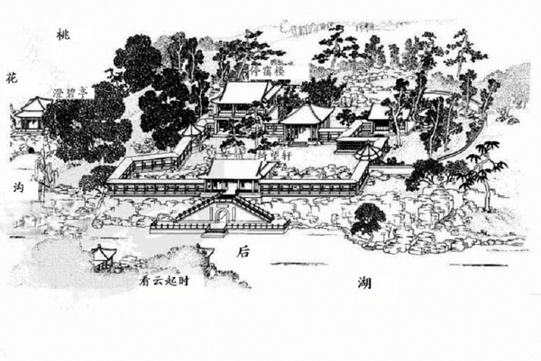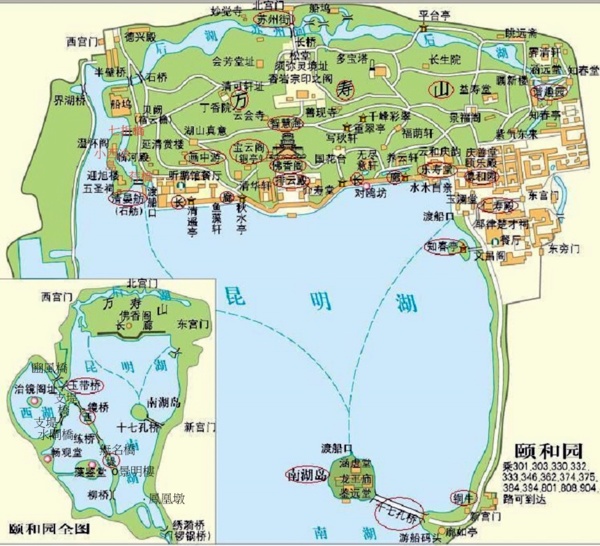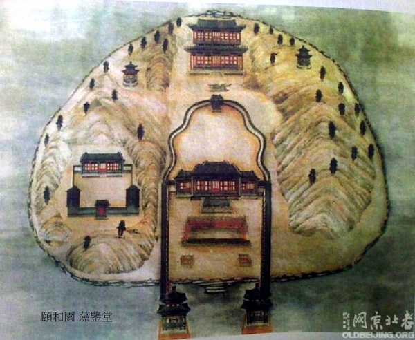 中國古代神話傳說,在東海中有蓬萊、方丈、瀛洲三座仙山,為神仙居所;因此一池三山是中國古代宮苑建築中常見的規劃形式. 通常表現為在一片水域中佈置三座島嶼. 中國古代民間園林中也多有在園中鑿池、並在池中佈置一島、二島或三島以像徵仙山的事例. 昆明湖(加南湖’西湖)是頤和園的標誌,湖長的像一個壽桃的形狀.佈置了南湖島、治鏡閣、藻鑒堂三仙山.