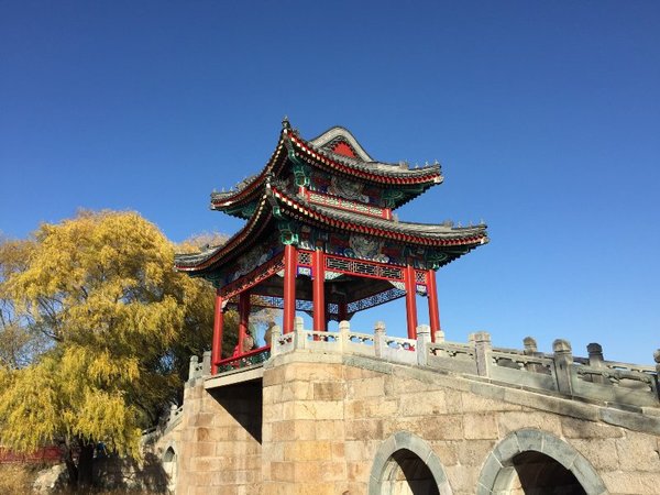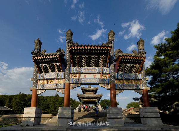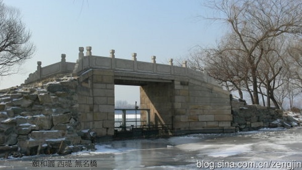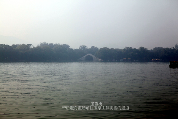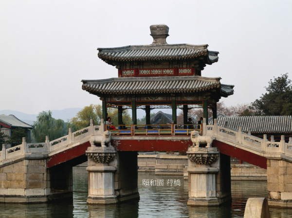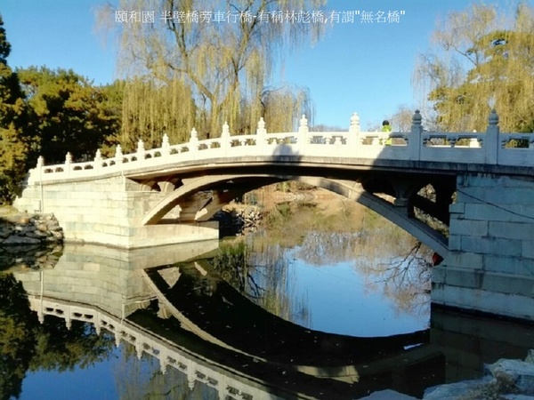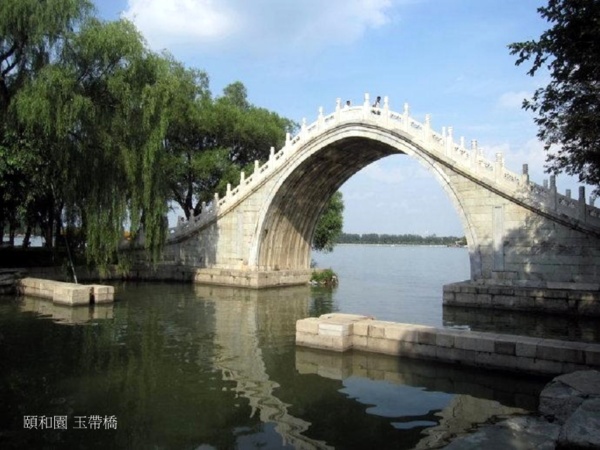 玉帶橋 玉帶橋為清乾隆時建造,造型仿長江三角洲地區石拱橋的風格,纖秀挺拔,輕巧為其特色.拱高而薄,曲線流暢挺立.橋身、橋欄選用青白石和漢白玉雕砌,潔白如玉,宛如玉帶,故名.橋下原為玉泉山泉水注入昆明湖的入水口,也是帝后乘船至玉泉山的通道. 橋頭留有乾隆皇帝的禦題,東面是“螺黛—痕平鋪明月鏡,虹光百尺橫映水晶簾.”西面是“地到瀛洲星河天上近,景分蓬島宮闕水邊多.