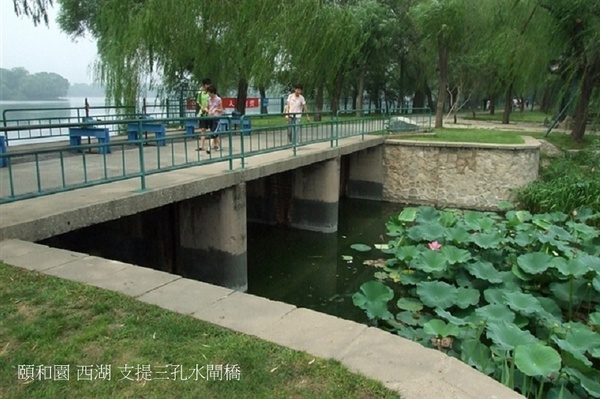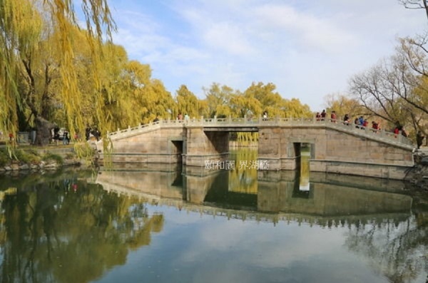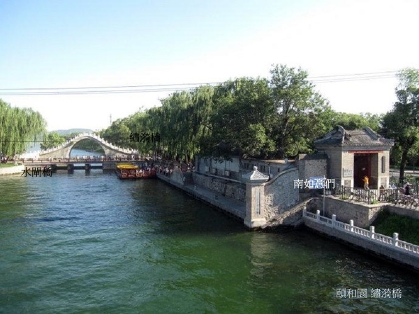 繡漪橋 繡漪橋在頤和園的南如意門內,是頤和園中最南端的橋,也是昆明湖和長河的界橋,也是東堤連接西堤的起點. 此橋的重要性,在於它是帝后們從長河水路來頤和園進入昆明湖必經的「大門」橋.