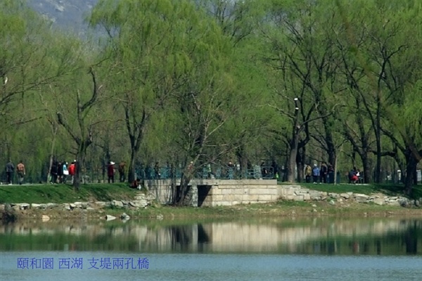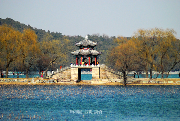 清華軒 界湖橋 界湖橋位於頤和園昆明湖內外湖與後溪河的分界處,是西堤最北面的橋樑. 該橋始建於1750年,1860年被英法侵略者焚毀,1886年慈禧太后重建. 在清漪園時代,這座橋叫柳橋,而西堤南端的柳橋則稱為界湖橋,重建頤和園時這兩座橋的名稱互易了. “堤長橫亙東西界,六橋首分內外湖”. 界湖橋為西堤六橋之第一,橋有三個方形橋洞.橋北原有路可直達德興殿和西宮門,與西如意門和後山的路徑通連. 橋西原有水村居、織染局等點景,已成為了頤和園的花圃所在地. 橋東南有大船塢、小蘇州街等臨水建築,站在橋上能望見半璧橋如一彎新月倒映在東逝的河水上面,環境幽雅宜人. 界湖橋長31.43米,橋身最寬處6.52米,最窄處4.28米,橋高約5.84米南北兩側各有20層台階,橋身兩側各有27個欄杆.