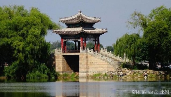 練橋 南朝詩人謝眺《晚登三山遠望京邑》:「餘霞散成綺,澄江靜如練」的詩.古人通常把白色的絲絹稱為練,此處則是以練喻水,雅的命名. 初築於乾隆時期,光緒年重建.此橋位於西堤平橋(有稱無名橋)北側,為單方孔石橋,其下部與鏡橋相似.橋上是一座四方形的尖頂亭. 駐足滿足觀賞南湖島、十七孔橋、佛香閣中軸線建築群、治鏡閣遺址、暢觀堂、藻鑒堂等景致. 夏日練橋西面的藻鑒堂湖中盛開著一片片紅白荷花,臆測乾隆觀賞荷花畫面,觀荷高點.
