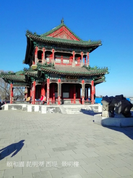 景明樓 景明樓是乾隆皇帝仿著岳陽樓的「神」來建的,《嶽陽樓記》是嶽陽樓的「內涵」. 北宋宋仁宗慶曆四年(1044年),滕子京被貶至嶽州,物阜民豐後重修嶽陽樓竣工, 致書同年進士范仲淹(即《與範經略求記書》一文)寫一篇《嶽陽樓記》, "范”文有自抒懷抱也規勸老友的;(「不以物喜,不以己悲、先天下之憂而憂,後天下之樂而樂」).也有觸景傷懷(若夫霪雨霏霏,連月不開,陰風怒號,濁浪排空,日星隱耀,山嶽潛形…..)’氣爽神清(至若春和景明,波瀾不驚,上下天光,一碧萬頃….)的感應;達到( 不以物喜,不以己悲…. 「先天下之憂而憂,後天下之樂而樂」)的共勉.乾隆知書卻未力行.一晃已逾耳順,就是能過濾話語,聽諂言.