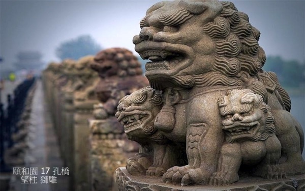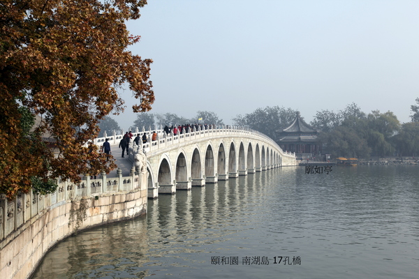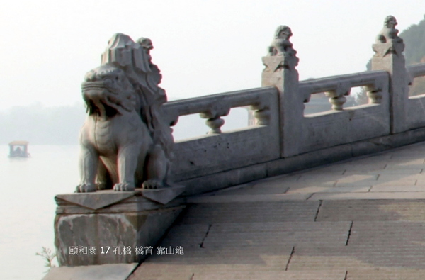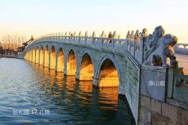 十七孔橋 十七孔橋橫跨在東堤和南湖島之中,始建於乾隆年間,它是頤和園裡最長最為精美的古橋. 橋設想成龜的脖子,連接的兩頭—廓如亭為龜頭,南湖島就相當於龜的殼,烏龜,寓意長壽. 橋長150米,寬8米,有17個拱形橋洞連續而成,橋體為青石,欄杆是漢白玉.橋欄望柱上的石獅共544隻,比盧溝橋的石獅還要多.最多的一個望柱上有一大五小,六隻石獅子.橋欄杆的兩頭還各有兩隻石刻異獸,俗稱「靠山龍」,形象威猛,極為生動.