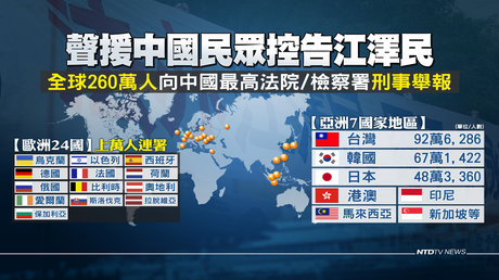 「全球聲援中國民眾控告江澤民的刑事舉報連署活動」歷經兩年半,亞洲七國、歐洲24國加入連署舉報。(新唐人亞太製圖)