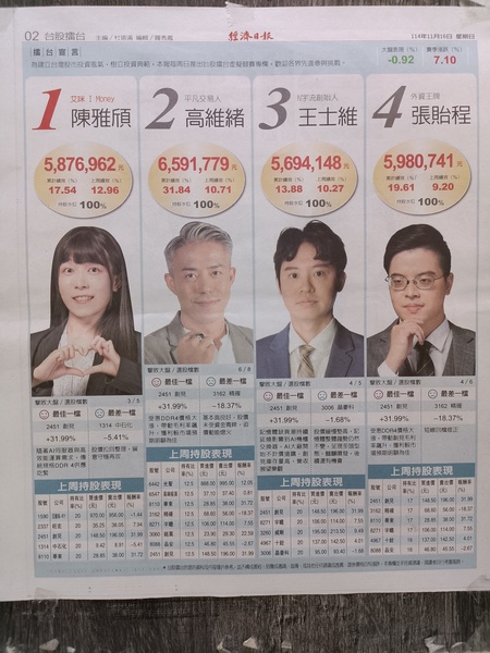 經濟日報台股擂台賽上週績效排行榜(114.11.16)