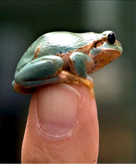 世界自然保育聯盟四日宣佈,二○○八年為青蛙年。圖為德國斯圖加特的自然歷史博物館所展示出的樹蛙,其嬌小的程度如同一食指般大。(歐新社)