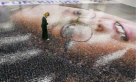世界最大的馬賽克拼貼相片十六日於德國紐倫堡展出,這幅作品長四十點五公尺、寬十四公尺,以九萬五千張小孩笑容的照片,拼貼出兩個孩童的笑臉,成功締造新的金氏世界紀錄。(歐新社)