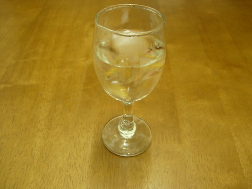 分滿水的高腳杯,拿給觀眾當場檢查,之後拿出一張紙,將紙用火燃燒,丟入高腳杯中,此時杯中瞬間變出許多的金魚來,看到的觀眾簡直不敢相信。