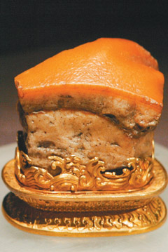 乍看之下,很像令人垂涎三尺、肥瘦相間的「東坡肉」的肉形石,為瑪瑙類礦物,在大自然中經過漫長歲月的累積,生成一層一層不同的色澤。經由工匠將原來質感豐富的石材加工琢磨,並將表面的石皮染色,使它的肉皮、肥肉、瘦肉層次分明,連毛孔和肌理都非常逼真。