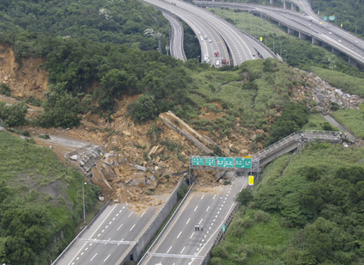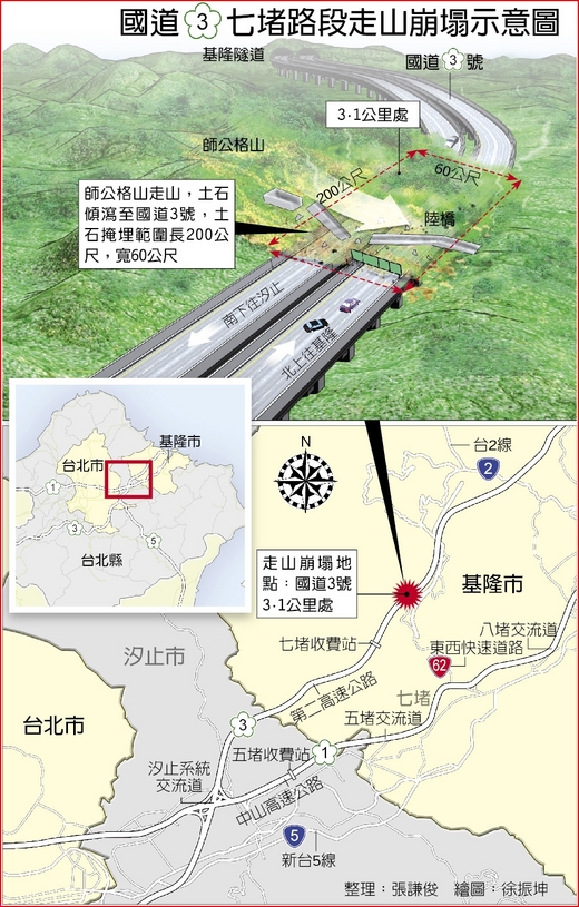 國道三號七堵路段走山崩塌示意圖 這是國道通車來首次因走山阻斷雙向道路的重大災害。崩塌面積至少三個足球場大,土石逾十萬立方,預估廿天才能全部清除。 台大地質系教授陳宏宇說,中山高和北二高經過基隆河之後的以北路段,地質屬砂岩和頁岩「互層」區域,砂岩層較厚,較薄的頁岩則顆粒較細、強度較低,昨日發生事故山頭可能因頁岩層經過長期風化加上雨水滲透,強度弱化而走山。 台大地理系教授陳于高也說,走山通常發生在地震或大雨過後,條件除了順向坡之外,還必須是可滑動的地層面,含水高低是關鍵。他說,該處地層有可能本來就已慢慢在滑動,壓力超過臨界值後,瞬間整個山就滑動下來 ****************************************************************************