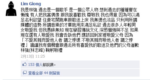 1990年林強以一首台語歌「向前走」風靡全台,也打開台語歌電子搖滾新市場,現在他多半都是從事一些電視廣告或是電影配樂工作,曾經幫多部國片製作配樂,而拿下三座金馬獎最佳原創電影音樂,但是當年一炮而紅的林強,卻也因此迷失自我,他在臉書寫下自己過去荒唐行為「想到過去的種種實在慚愧 有人把我當偶像 跟我說喜歡我 尊敬我 我也得意 因為可以滿足名利欲望 住豪宅開跑車跟歌迷上床 我無德也沒品」,「現在學習傳統文化 深感懺悔與不足 如果現在還有人敬愛我 我會告訴他們 應該回到家裡敬愛父母」,林強在懺悔的同時,更希望大家能夠百善孝為先。 ※延伸閱讀 【2011/02/20 聯合追星網】 |
