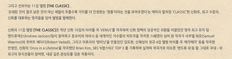 ![]() ![]() ![]() ![]() ![]() ![]() ![]() 1998年3月24日,這一切的開始.... 15年後的今天,現在開始Chapter 2的神話!!! 超越時代,長久以來被選為“最高”的CLASSIC!!2013年5月現在開始,神話就是CLASSIC!!! 去年打破4年的空白,以神話之名回歸的ERIC,李玟雨,申彗星,金烔完,Junjin和Andy,仿佛令時間的流逝都蒼白一般展示著“完美”本身而成功回歸。 出道後一直堅持“因為神話而可能”的Powerful,Stylish的舞臺表演,抓住觀眾的心的神話,到4年後重新聚在一起成功回歸為止,如果說這段時間是展示國內歌謠界歷史上誰都無法做到的“Only one神話”的Chapter 1,5月16日發行的1輯將是展示新的神話的Chapter 2的開始。 迎接出道15年,在3月份舉行的,然後發行的11輯“THE CLASSIC”“要展現,長久的並不是舊的,而是經年累月造就的,更加被承認價值的名品”就像Eric的這段話一樣,CLASSIC的神話將收集最高水準的,能夠代表神話的名曲發行專輯。 神話11輯“THE CLASSIC”有去年作曲10輯主打歌Venus,令神話成功回歸的英國最高音樂隊Andrew Jackon的參與,還有作曲美國的Bon Jovi,日本的嵐等世界性歌手的Hit曲的瑞典作曲家Samuel Waelmo,Robert Vadadi,打造李孝利“Ten minute”的金道賢,作曲申彗星4輯“滴答滴答”的安英民,作曲神話8輯Once in a life time的Brain Kim,在SBS Kpop Star中成為TOP3的Andrew Choi等。11輯是由國內外最高音樂人參與的,高完成度的專輯。 還有,通過進行到最後的激烈競爭,被選為11輯主打歌的“This love”這首歌是由作曲神話8輯Once in a life time的Brain Kim作曲,英國最高Music team Andrew Jackson 和 Lee MCcutcheon送給神話的“最高Dance Track”夢幻般的序曲和時尚的節奏是特點的電音舞曲“This love”是為了爭取愛情而活著,夢想無盡的愛情的,表達對愛情的無盡熱情的歌曲。 作曲家Andrew Jackon隊在去年作曲Venus後深陷神話的音樂魅力,在這次的專輯作業中首先發出Love call,展示連後續Mixing都參與進來的熱情,共同打造出了名曲。 與這樣誕生的主打歌一起,在神話的這次專輯中既有之前一直一起作業的作曲家們的歌,也有新人作曲家的歌,力求打造不失神話已有的音樂色彩,又展示神話新的魅力。 成員李玟雨參與“是這樣,Hurricane,New Me,I Gave you”等四首曲子的作詞,Eric負責整片歌曲的Rap部分作詞。本次專輯是為了打造最高的專輯而作曲家們和神話成員一起盡各自的音樂才能而成。 除了歌曲以外,參與專輯封面攝影的國內最高攝影師趙仙姬作家,監製Psy的“江南Style,Gentleman”少女時代“Gee”,Shinee的“Why so seriou”的MV導演趙秀賢導演等大舉參與。這次專輯將成為可聽,可看,可享受的,長時間被承認其價值的神話的代表名品專輯。 成功完成神話15周年紀念演唱會的他們將以此紀念與粉絲一起度過的,對神話特別的2013年的開始。 2013年5月16日,神話的Chapter 2“THE CLASSIC”將與以神話成就神話,神話歷史上留下最強烈印象的最高的專輯見面。 來源:神話公司官方網站 翻譯:akisameyuhi@神話吧翻譯組 |