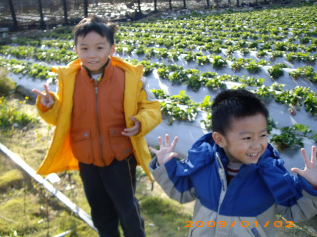 原本利用假期要到宜蘭泡湯, 但是考慮到可能下雨掃了興致, 剛好此刻是草莓的季節, 所以就開車南下, 朝著有太陽的方向開去. 沒想到大家都跟我們相同, 一路上塞車. 從南崁出發, 到中壢交流道竟然花了快一個小時, 因此決定走省道. 不過這小小的台灣真的沒多少地方好去, 大家都擠到一塊了. 到了苗栗之後, 轉往大湖方向, 大概五六公里之前就已經整條馬路跟停車場一樣. 好不容易找了一處有停車場的農場, 但是果不出所料, 草莓已經早一步被摘光了. 因此老婆去問了老闆, 他們說整個大湖的街上都採光囉! 這下可糟糕了, 沒泡湯又沒有草莓可摘, 小孩子已經不耐煩了! 因為事先我有讓老婆準備好衣物, 因此我們決定再試試看當地的溫泉旅店是不是有空的房間, 這樣至少不必在大湖街上塞車塞到天黑... 趁著上車前,至少讓孩子拍了照片有來此一遊.